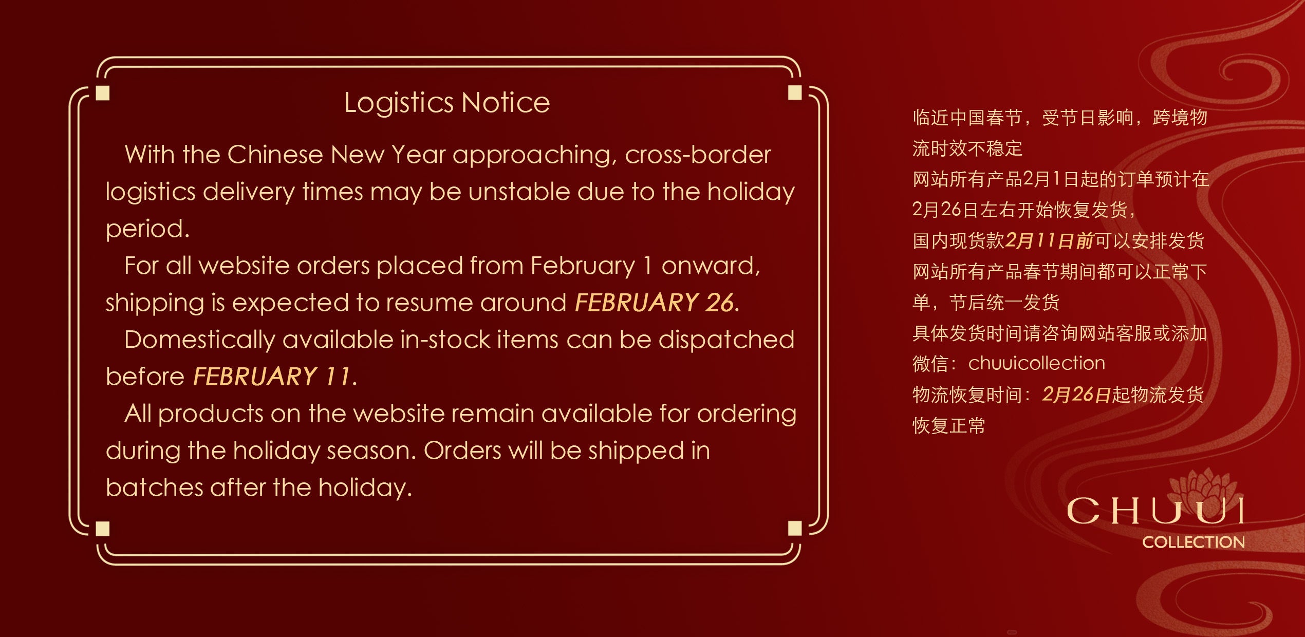 With the Chinese New Year approaching, cross-border logistics delivery times may be unstable due to the holiday period.