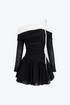 This striking black and white dress features a fitted off-shoulder bodice, playful flared mini skirt, and elegant draped white overlay with a floral embellishment.