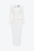 Radiate timeless elegance in this midi dress, featuring a structured silhouette, a waist twist detail, a square neckline, and gold-tone embellishment for a modern yet refined touch, ideal for evening events or formal occasions.