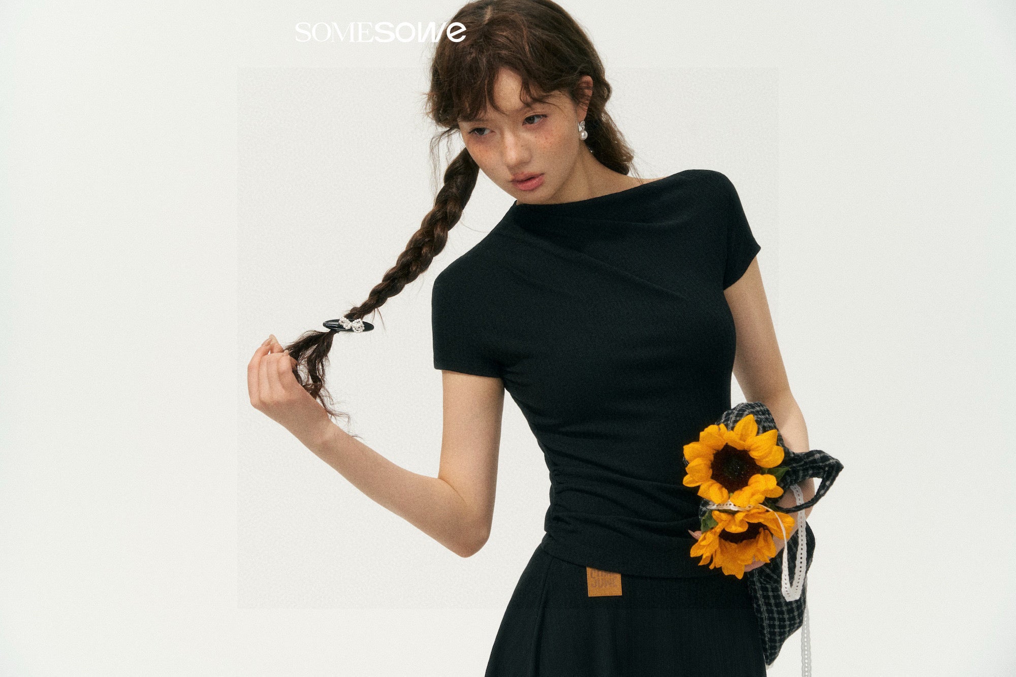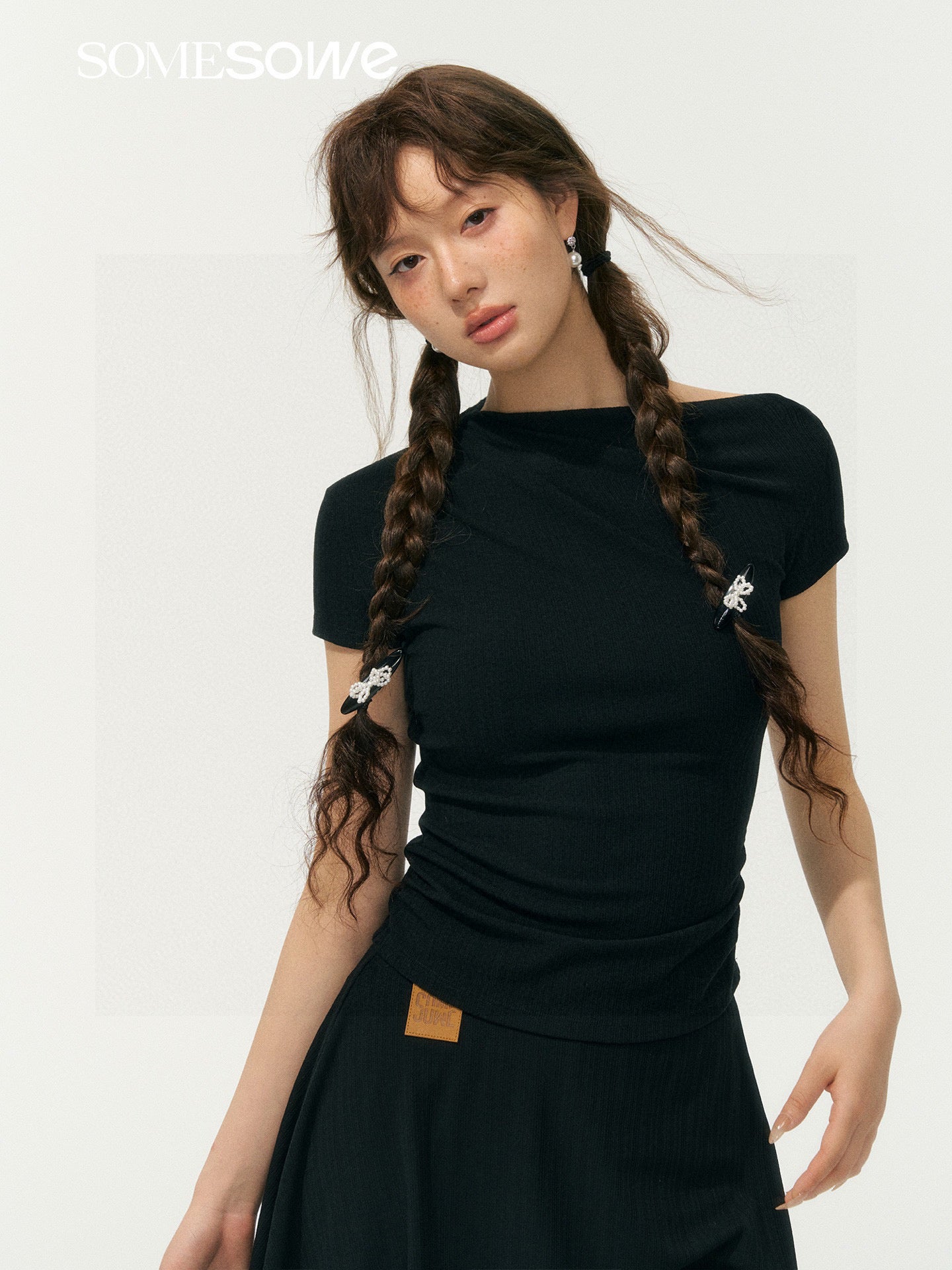 SOMESOWE S2508071 Asymmetrical Shoulder Ruched T-Shirt (2color)