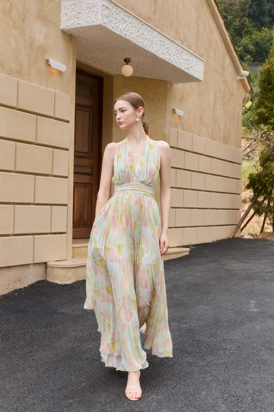 Wardrobes by chen Vacation chiffon printed pleated deep V-dress