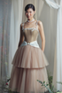 Special Features: 3D Leaf Embellishments at the neckline and strap, Corset waist, Taffeta waist band, Attached metallic butterfly button, Layered tulle skirt.