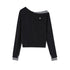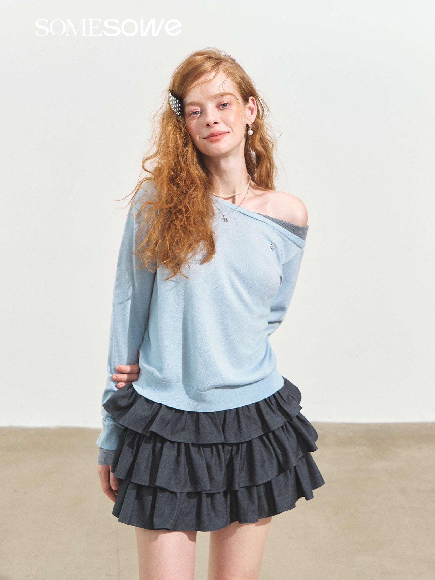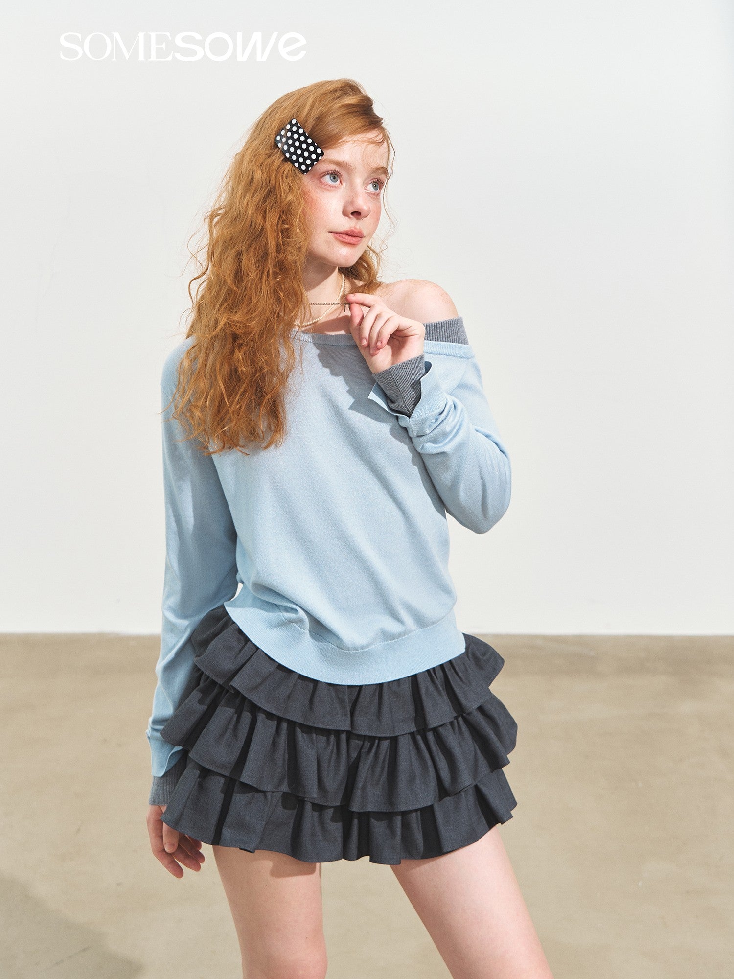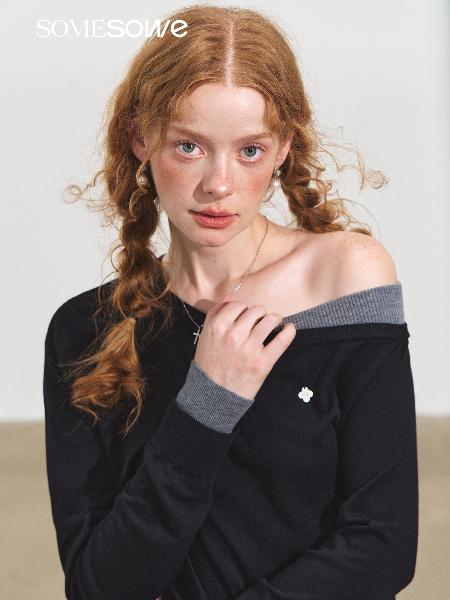 SOMESOWE S2508250 Color blocked off shoulder fake two piece sweater